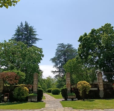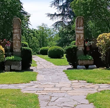 Jardin de Jasses, à l’abri derrière son portail de pierre. Ces espaces discrets, invisibles depuis la rue, témoignent de l’art de vivre béarnais et de la transmission silencieuse des générations.